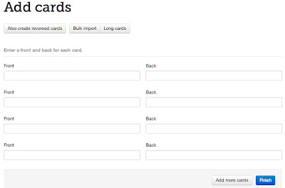 Step 2: Begin adding your cards. You can type in your cards, do a bulk import, or create "long cards" which is the same as regular cards, just allows for more writing to be done. There's also an option for you to create reversed cards to go along with the cards that are all facing the ONE way (alternate fronts and backs, so definitions and words for example). Click FINISH and your cards are ready to use!